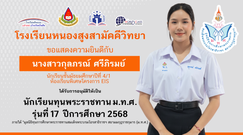 โรงเรียนหนองสูงสามัคคีวิทยา ขอแสดงความยินดีกับนักเรียนทุนพระราชทาน ม.ท.ศ. ได้แก่ นางสาวกุลภรณ์ ศรีภิรมย์ ชั้น ม.4/1 ห้องเรียนพิเศษโครงการ EIS ที่ได้รับอนุมัติให้เป็นนักเรียนทุนพระราชทาน ภายใต้ “มูลนิธิทุนการศึกษาพระราชทานสมเด็จพระบรมโอรสาธิราชฯ สยามมกุฎราชกุมาร (ม.ท.ศ.)” รุ่นที่ 17 ประจำปีการศึกษา 2568 ตามหลักเกณฑ์ เรียนดี ประพฤติดี มีความพร้อมเข้ารับการฝึก และพัฒนาศักยภาพ