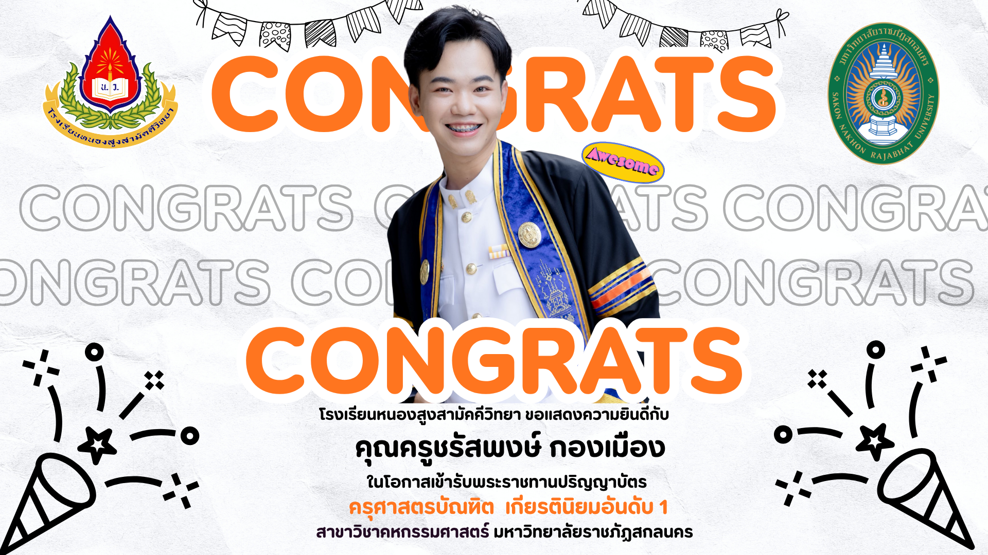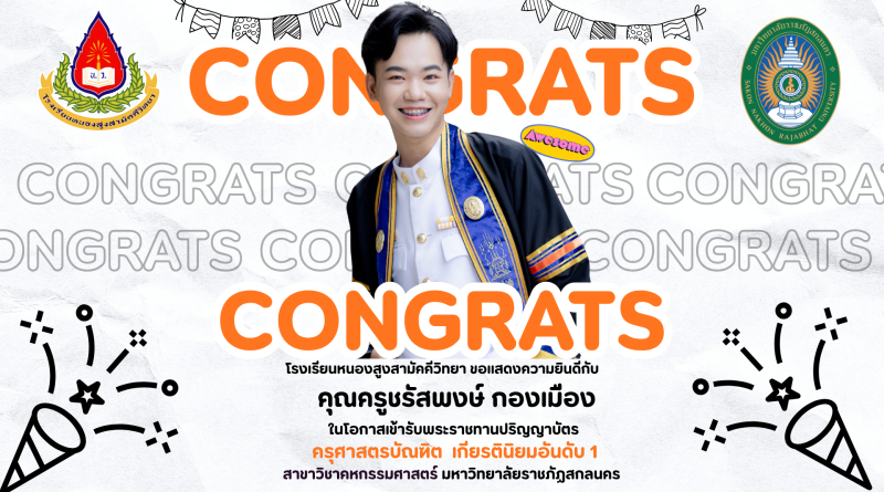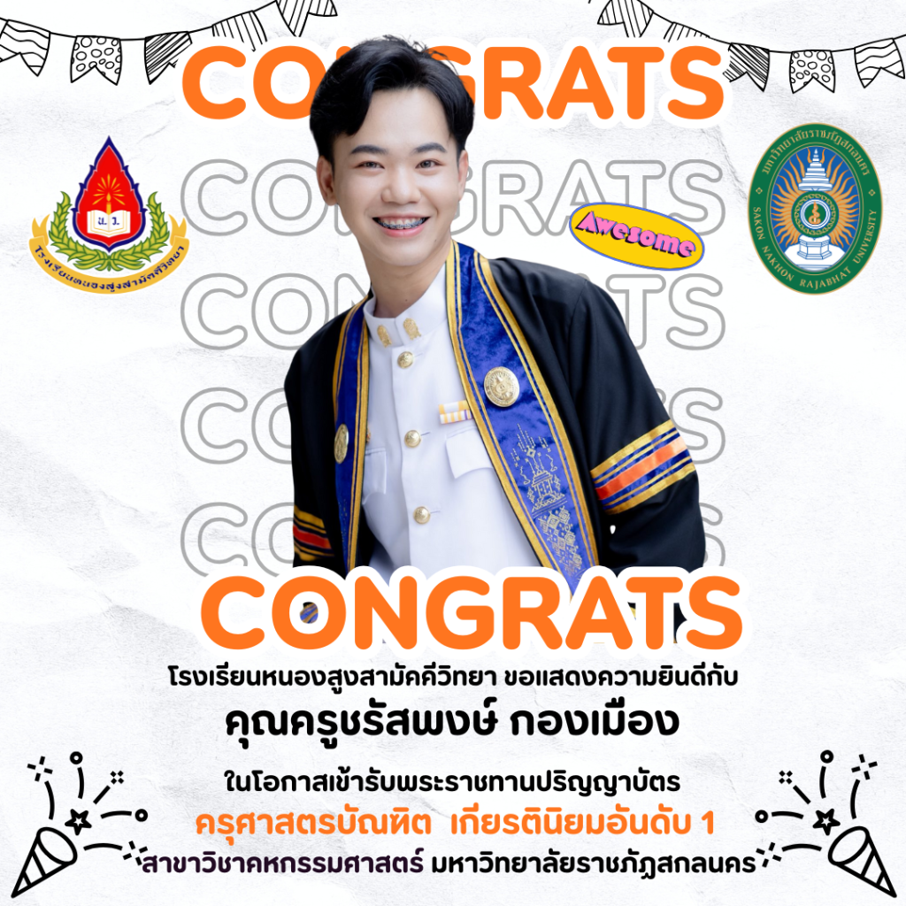 โรงเรียนหนองสูงสามัคคีวิทยา ขอแสดงความยินดี กับ คุณครูชรัสพงษ์ กองเมือง ตำแหน่ง ครูผู้ช่วย กลุ่มสาระการเรียนรู้การงานอาชีพ ในโอกาสเข้ารับพระราชทานปริญญาบัตร ครุศาสตรบัณฑิต เกียรตินิยมอันดับ 1 สาขาวิชาคหกรรมศาสตร์ มหาวิทยาลัยราชภัฏสกลนคร