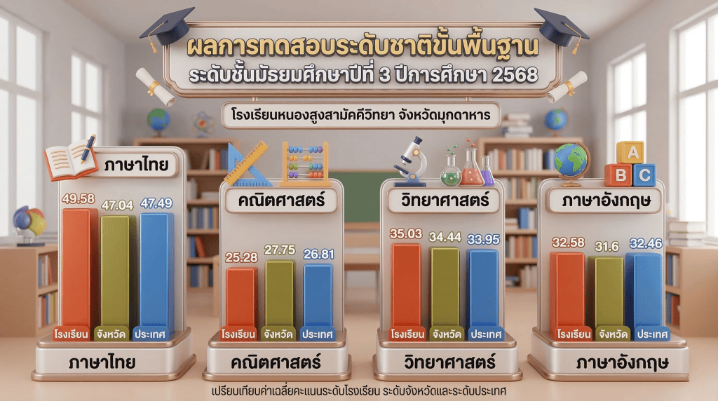 🏫 โรงเรียนหนองสูงสามัคคีวิทยา จังหวัดมุกดาหาร 📍 ขอแสดงความชื่นชมและ 🎉 ยินดีกับนักเรียนระดับชั้นมัธยมศึกษาปีที่ 3 🎓 ที่ได้ร่วมกันสร้างผลสัมฤทธิ์ทางการเรียนอันน่าภาคภูมิใจ โดยผลคะแนนเฉลี่ยในภาพรวมแสดงให้เห็นถึงพัฒนาการที่เข้มแข็งของสถานศึกษา ดังนี้: